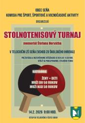 (11.2.2026) Obec Seňa a Komisia pre šport, športové a voľnočasové aktivity pozývajú verejnosť na stolnotenisový turnaj – memoriál Štefana Horvátha, ktorý sa uskutoční v sobotu 14. februára 2026 o 9:00 v telocvični ZŠ Seňa (vchod zo školského ihriska). Prezentácia a rozcvičovanie súťažiacich prebehne od 8:30 do 8:50. Súťaží sa podľa pravidiel stolného tenisu.