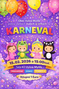 (11.2.2026) Obec Vyšná Myšľa pozýva všetkých malých aj veľkých na karneval, ktorý sa uskutoční v nedeľu 15. februára 2026 o 15:00 v sále Kultúrneho domu Vyšná Myšľa. Účastníkov čaká zábavné popoludnie plné radosti, hudby a tanca. Pripravené je prekvapenie, diskotéka aj tombola. Vstupné je 1 €.