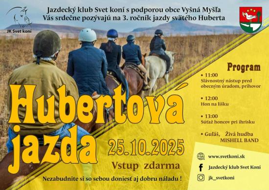 - Vo Vyšnej Myšli hrajú prím kone. O 11:00 hod. začína Hubertova jazda, na ktorú pozýva Jazdecký klub Svet koní spolu s obcou. O 13:00 hod, bude pri ihrisku aj súťaž honcov.