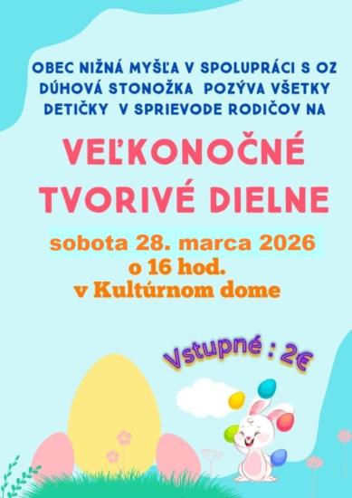 (27.3.2026) Obec Nižná Myšľa v spolupráci s OZ Dúhová Stonožka pozýva všetky deti v sprievode rodičov na Veľkonočné tvorivé dielne. Tešíme sa na vás v Kultúrnom Dome v sobotu 28. marca 2026 o 16:00. Vstupné sú 2 eurá.
