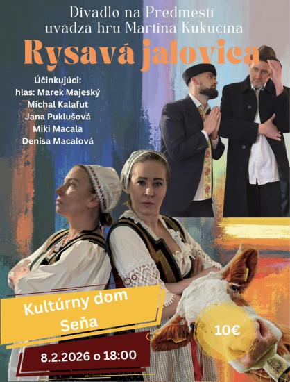 (26.1.2026) Divadlo na Predmestí uvedie hru Martina Kukučína Rysavá jalovica v nedeľu 8. februára 2026 o 18:00 v Kultúrnom dome v Seni. Vstupné je 10 €. Lístky si môžete zakúpiť na obecnom úrade počas úradných hodín.