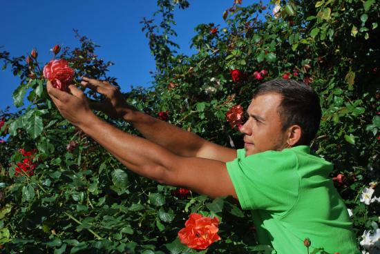 Víta nás Pavol Bohuš, zakladateľ rozária v Nižnej Myšli. Jeho pomocník, sympatický mládenec Martin Jano, kvôli ktorému kráľovstvo ruží tentoraz navštevujeme, práve do vedra zhrabúva opadnuté lupene.