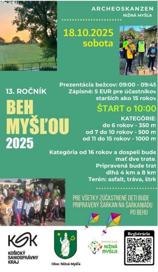 (10.10.2025) OZ Športový klub Nižná Myšľa a obec s podporou KSK organizujú v sobotu 18.10.2025 so začiatkom o 10:00 hod. 13. ročník tradičného Behu Nižnou Myšľou v archeologickej lokalite. Tešíme sa na každého športovca - bežca, pre všetky zúčastnené deti bude pripravený šarkan na Šarkaniádu, ktorá sa uskutoční po behu. Pripravili sme aj malé občerstvenie.